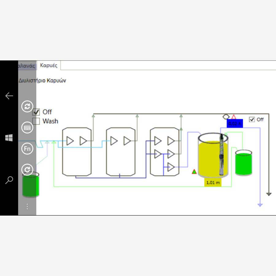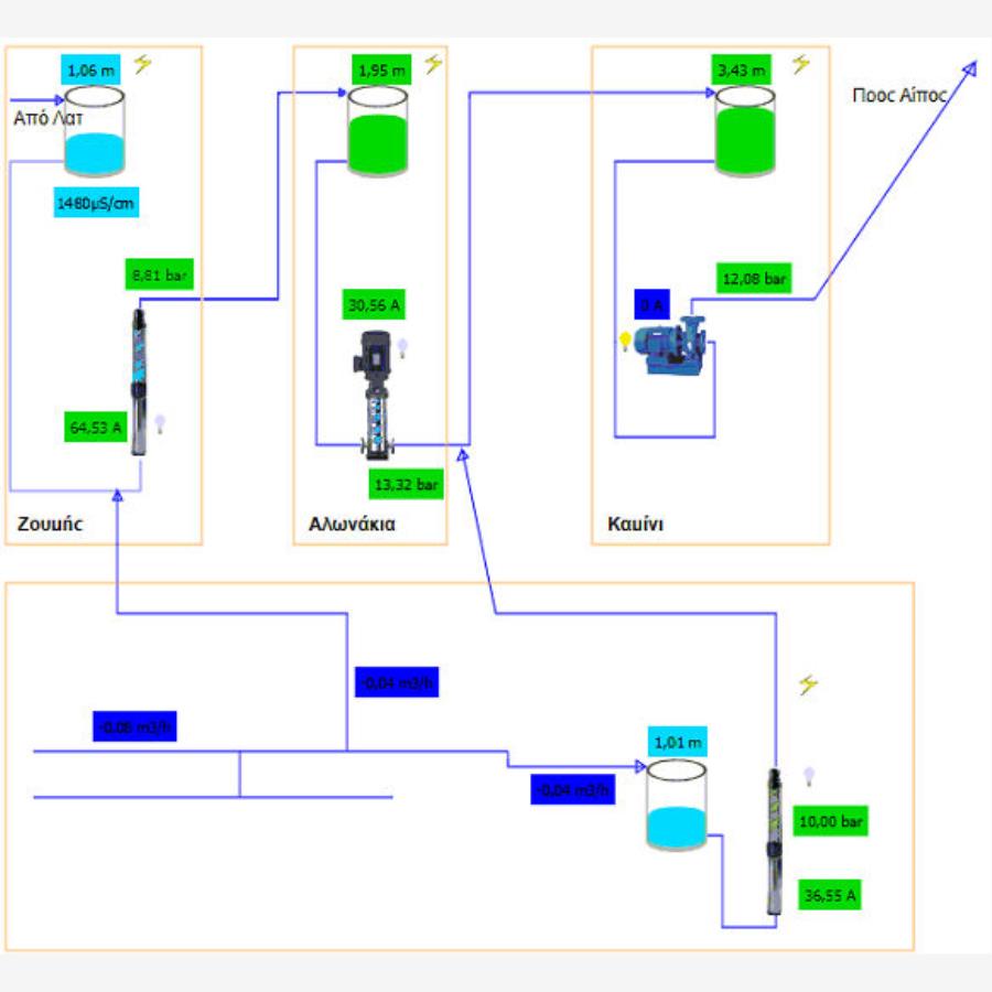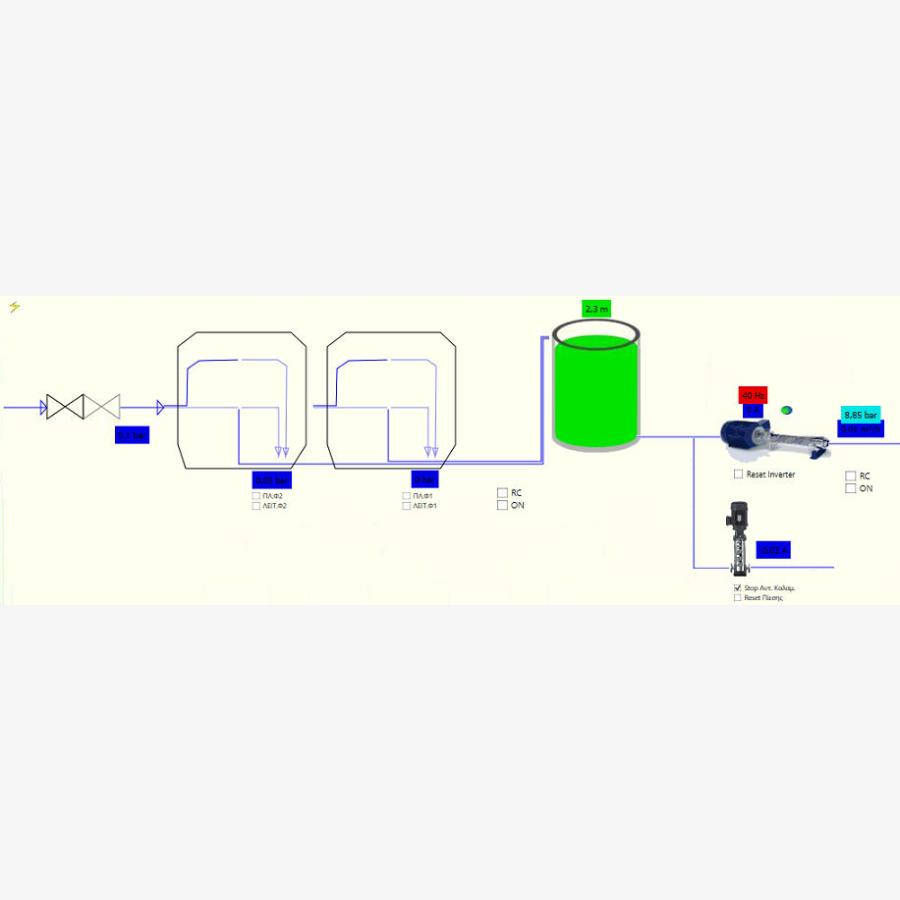 Σύστημα αυτοματισμού και SCADA για την λειτουργία οικιακής μονάδας επεξεργασίας νερού δικτύου ύδρευσης (τεχνολογίας αντίστροφης ώσμωσης) προκειμένου να καταστεί πόσιμο. Στο συγκεκριμένο σύστημα συνδυάζονται μετρήσεις από αισθητήρες με τιμές που παράγονται από το μοντέλο λειτουργίας της μονάδας, προκειμένου να υπάρξει συμβουλευτική στήριξη από το SCADA, για ευκολότερη ρύθμιση και μακροβιότητα των μεμβρανών αντίστροφης ώσμωσης και του υπόλοιπου εξοπλισμού.