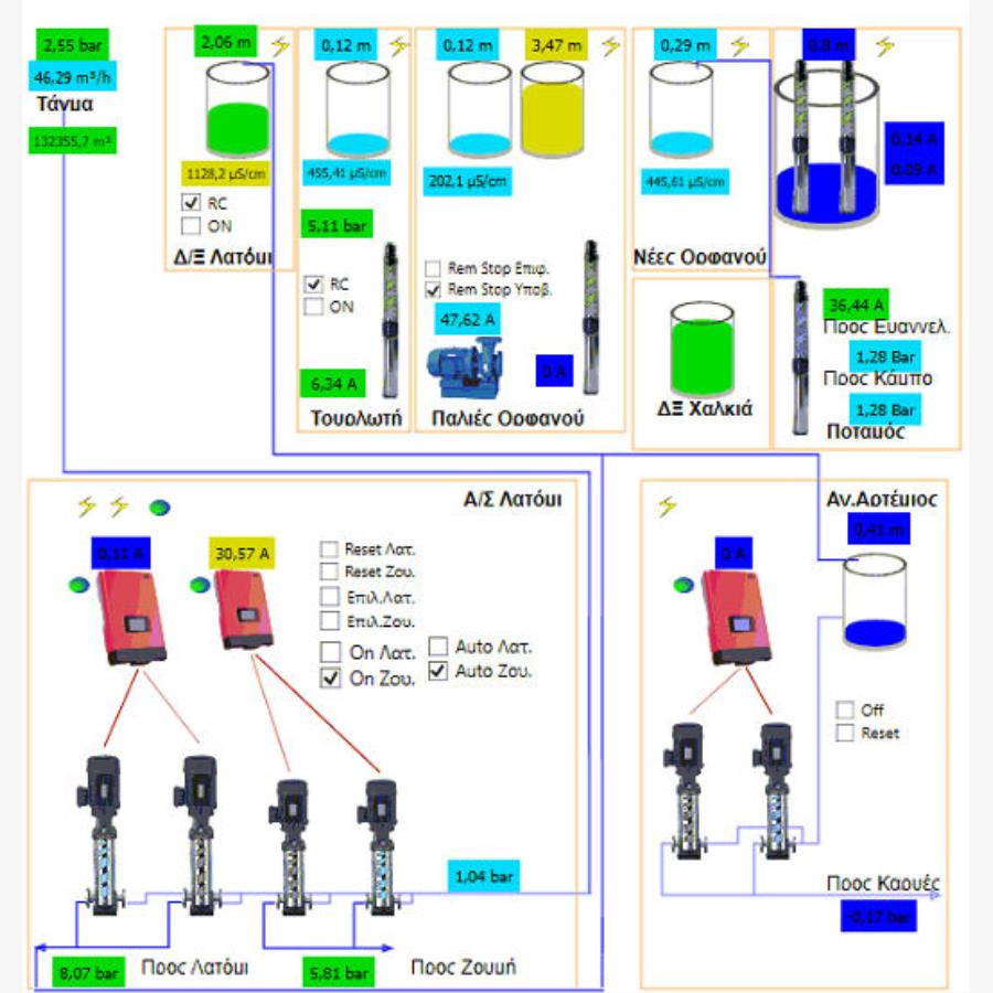 Εγκατάσταση συστήματος SCADA με αυτόματη λειτουργία και χειρισμούς σε εγκαταστάσεις τεσσάρων μονάδων αφαλάτωσης, των γεωτρήσεων και των δεξαμενών τροφοδοσίας τους, της δεξαμενής παραγόμενου νερού και του αντλιοστασίου προώθησής του και των γεωτρήσεων στη θέση Θόλος, της υδρομάστευσης και των αντλιών στην περιοχή Δελφίνι. Πλήρης αυτόματη λειτουργία και απομακρυσμένοι χειρισμοί των αντλιοστασίων. Ειδοποιήσεις προσωπικού για βλάβες, παρακολούθηση μέσω διαδικτύου.Οι επικοινωνίες των απομακρυσμένων συστημάτων υλοποιήθηκαν με χρήση ασύρματου δικτύου WiFi και αναμεταδότών WiFi, για αποστάσεις μεγαλύτερες των 15 χιλιομέτρων.